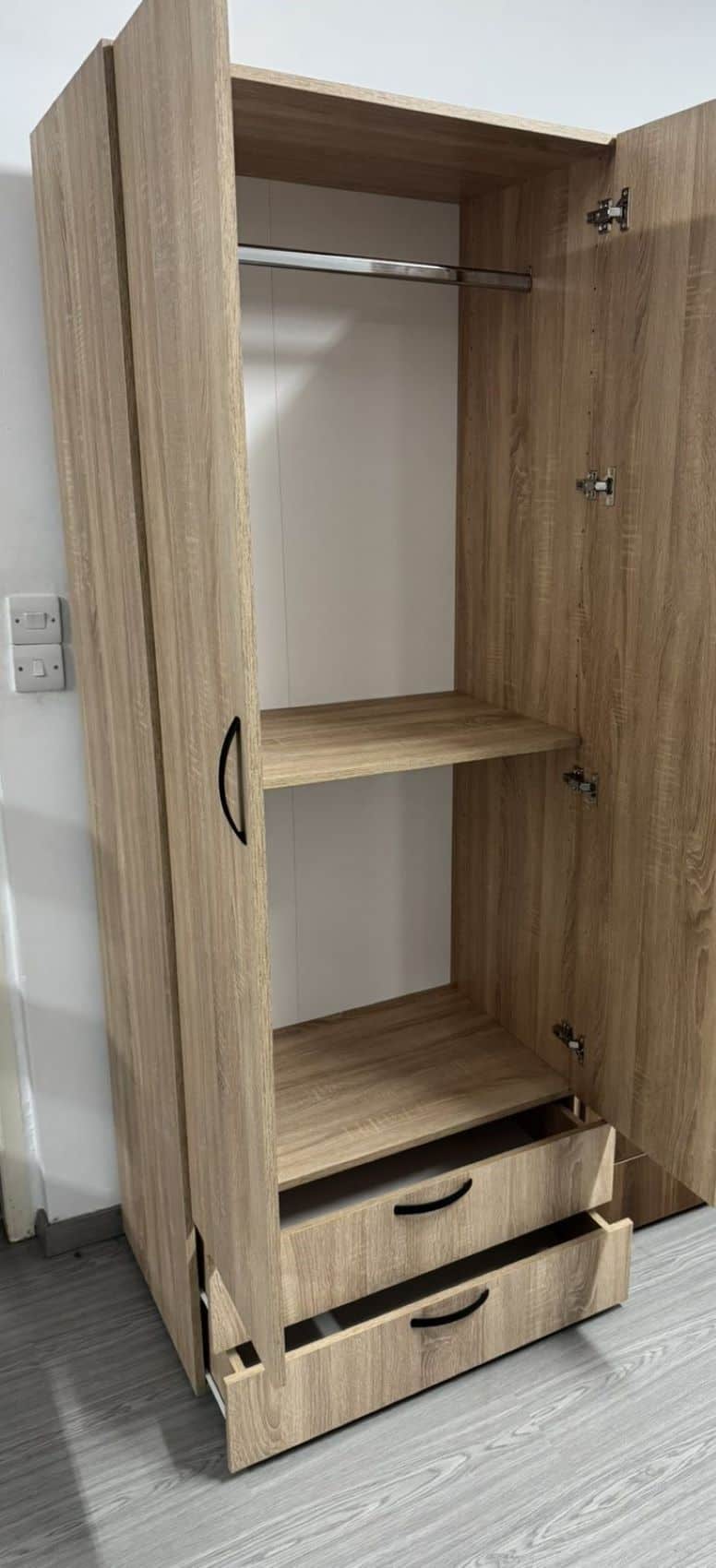 Η δίφυλλη ντουλάπα CHIC είναι μια πρακτικότατη ντουλάπα που έχει φτιαχτεί με γνώμονα την όσο το δυνατόν καλύτερη εκμετάλλευση του χώρου. Η ανοιγόμενη 2 φυλλη ντουλάπα έχει ιδιαίτερα άνετους χώρους στο εσωτερικό της. Διαθέτει μεταλλική βέργα κρέμασης ρούχων με κενό από κάτω 145cm για κρεμαστά ρούχα. Στο κάτω μέρος υπάρχουν 2 συρτάρια με μηχανισμό Soft Close. Τα ποδαρικά στην ντουλάπα είναι πλαστικά ύψους 2cm με βίδα μικρής ρύθμισης ύψους. Έχει εσωτερικό ράφι, το οποίο μπορεί να τοποθετηθεί σε διάφορα σημεία στο εσωτερικό, με βάση τις εκάστοτε ανάγκες χρήσης.